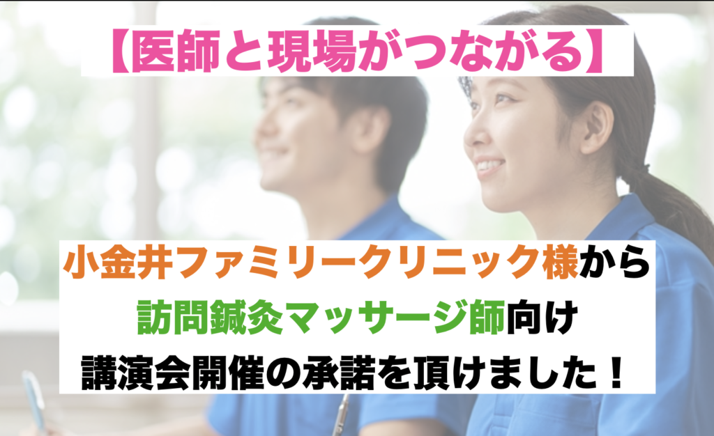 - 小金井ファミリークリニック様より講演会のご承諾をいただきました!(3月16日開催予定)こんにちは!からだアシスト代表の大上です。 この度、小金井ファミリークリニック様より、訪問鍼灸マッサージ師向け講演会の開催について、ご承諾をいただきました! 開催予定日は、 **2026年3月16日(月)19時〜**です