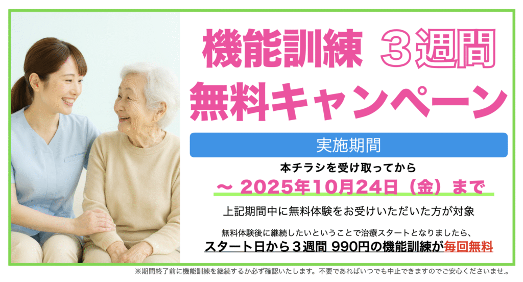 - 【期間限定】機能訓練3週間無料キャンペーンのお知らせからだアシストでは、訪問マッサージ・はり灸に加えて、機能訓練を組み合わせたサービスを行っています。 このたび、多くの方に体験していただけるよう【期間限定キャンペーン】を実施いたします。 キャンペーン概要 こんな方におすす