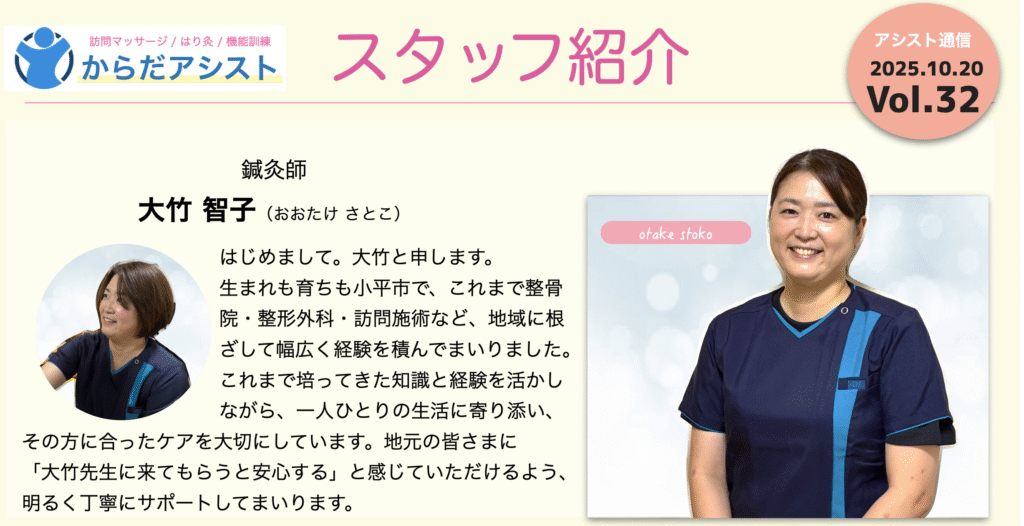 - 🌸新しい仲間のご紹介|地元・小平出身の大竹先生がチームに加わりました!こんにちは。株式会社アシスト/からだアシスト代表の大上です。 このたび、2025年10月1日付で大竹先生が新しく「からだアシスト」に仲間入りしてくれました。 夏頃から何度かお話を重ねる中で、当社の理念や地域密着のスタイル