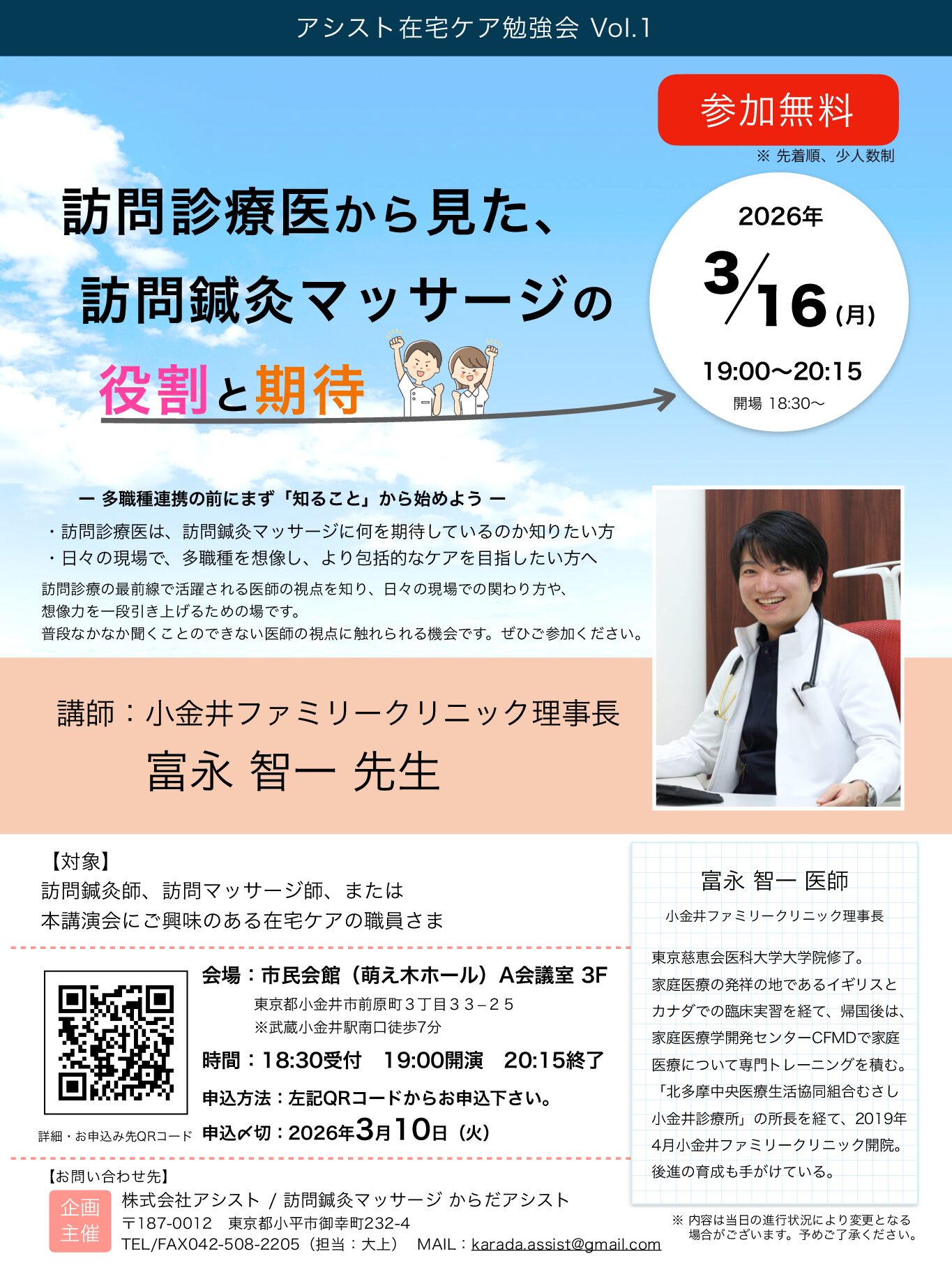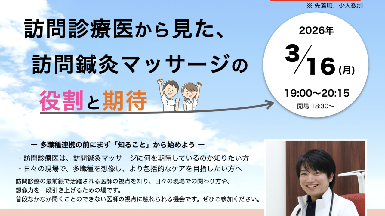 このたび、訪問診療医の先生をお招きし、「訪問診療医から見た、訪問鍼灸マッサージの役割と期待」
